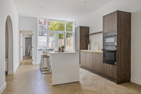 Via the well-kept front garden with private driveway for two cars you reach the bicycle shed and entrance on the side of the house. An additional entrance has been created via the front garden with direct access to the kitchen. Hall with meter cupboard, staircase, modern toilet with washbasin and access to the spacious living/dining room. The luxurious, modern kitchen with cooking island is located at the front of the house and is equipped with various Siemens built-in appliances, including a refrigerator, freezer, 5-burner induction hob with gas wok burner, stainless steel hood, combi oven, sink and dishwasher. From the kitchen, the stair cupboard is accessible as well as the front garden via the existing tilt and turn door at the front of the house. The living and dining area are located at the rear with a view of the sunny garden. The patio doors provide access to the beautifully landscaped backyard (located on the southwest) with decking and on the water. The ground floor has a modern tiled floor with underfloor heating.